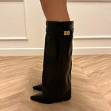 Deze laarzen van 100% veganistisch leer zijn meer dan alleen een accessoire – ze zijn een echt stijlstatement. Het ontwerp, dat een oversized silhouet combineert met op maat gemaakte details – zoals de gouden gesp en de omhullende textuur – trekt de aandacht en herdefinieert de regels van urban fashion.